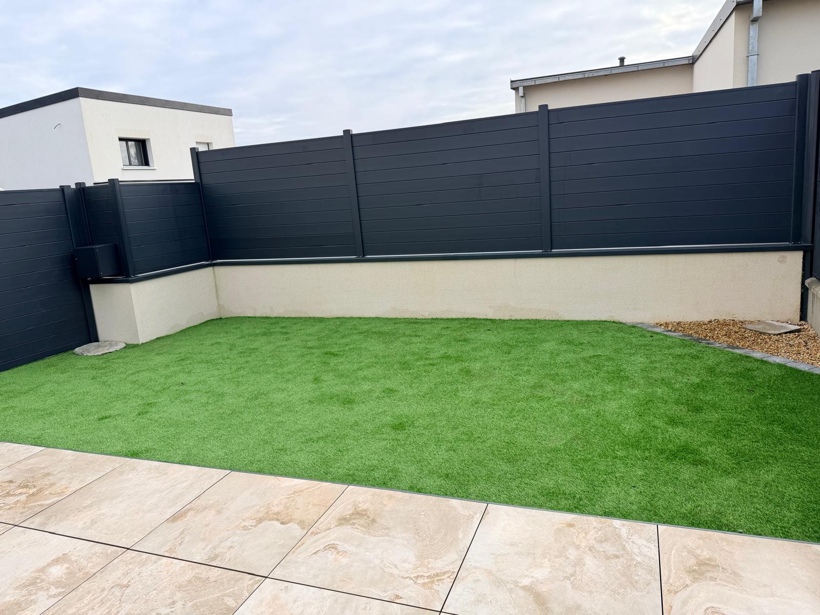 Nous installons des clôtures alu sans traverse haute ni basse, référence Palisota, composées de lames pleines 120 x 20 mm.