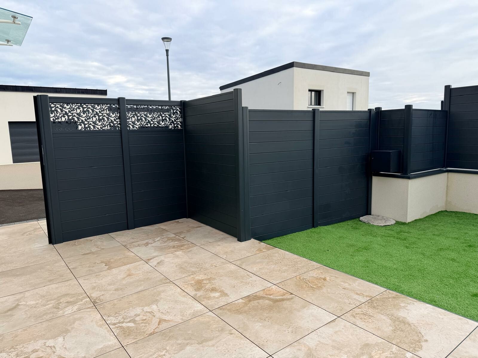 Aménagement extérieur clôtures alu gris 7016 store banne coffre motorisé