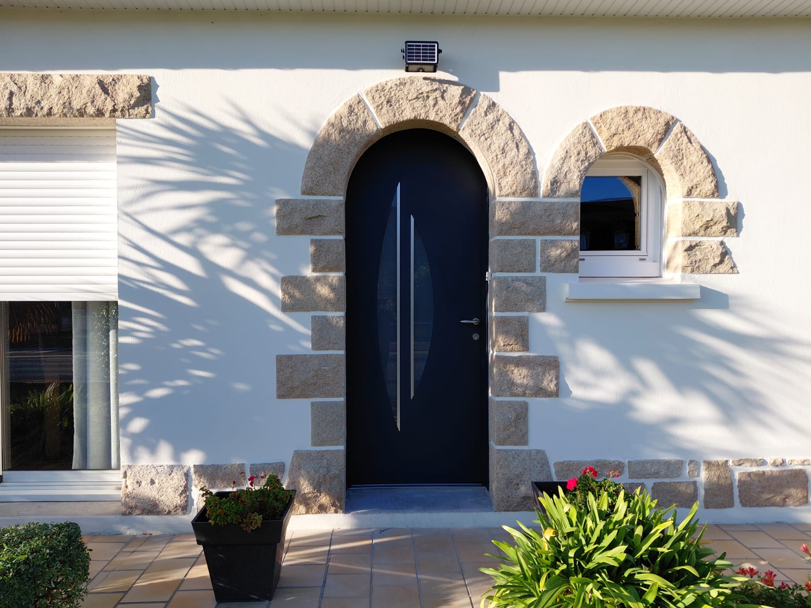 La porte s’intègre dans une entrée en pierre, en conservant l’ouverture cintrée existante.
